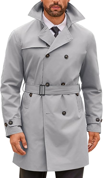 Mens Double Breasted Trench Coat Notched Lapel Windbreaker Jackets Causal Overcoat With Belt