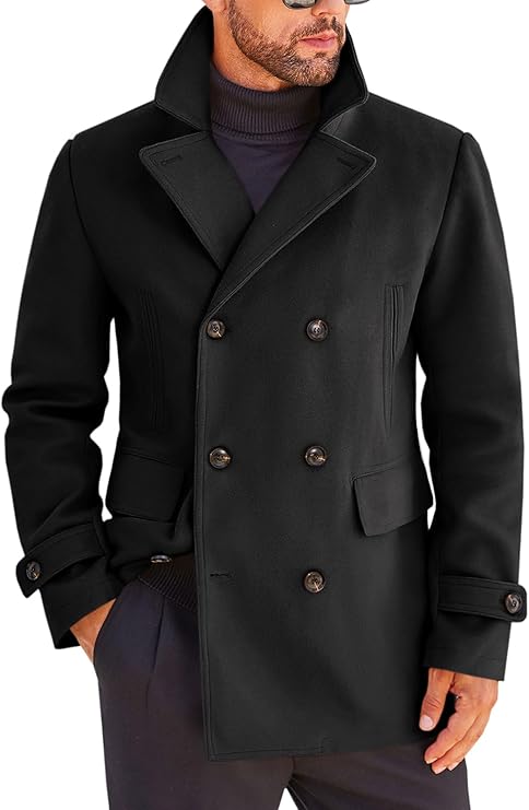 Men's Wool Blend Double Breasted Pea Coat Classic Notched Collar Warm Woolen Coats Winter Outwear Jackets
