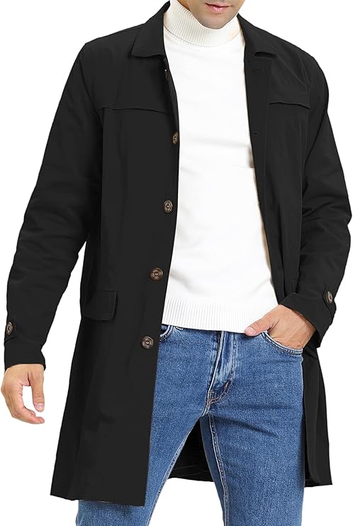 Men's Trench Coat Single Breasted Button Down Jacket Long Overcoat