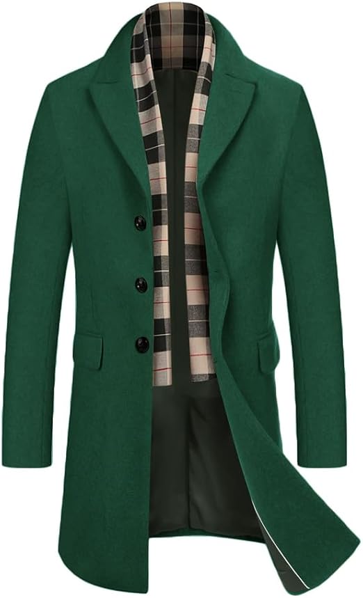 Men's Wool Blend Coat with Detachable Plaid Scarfs Notched Collar Single Breasted Pea Coat Trench Overcoat